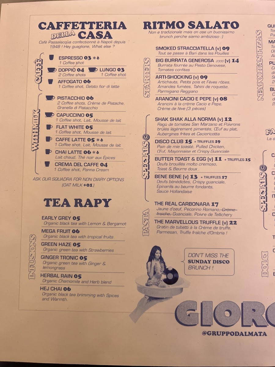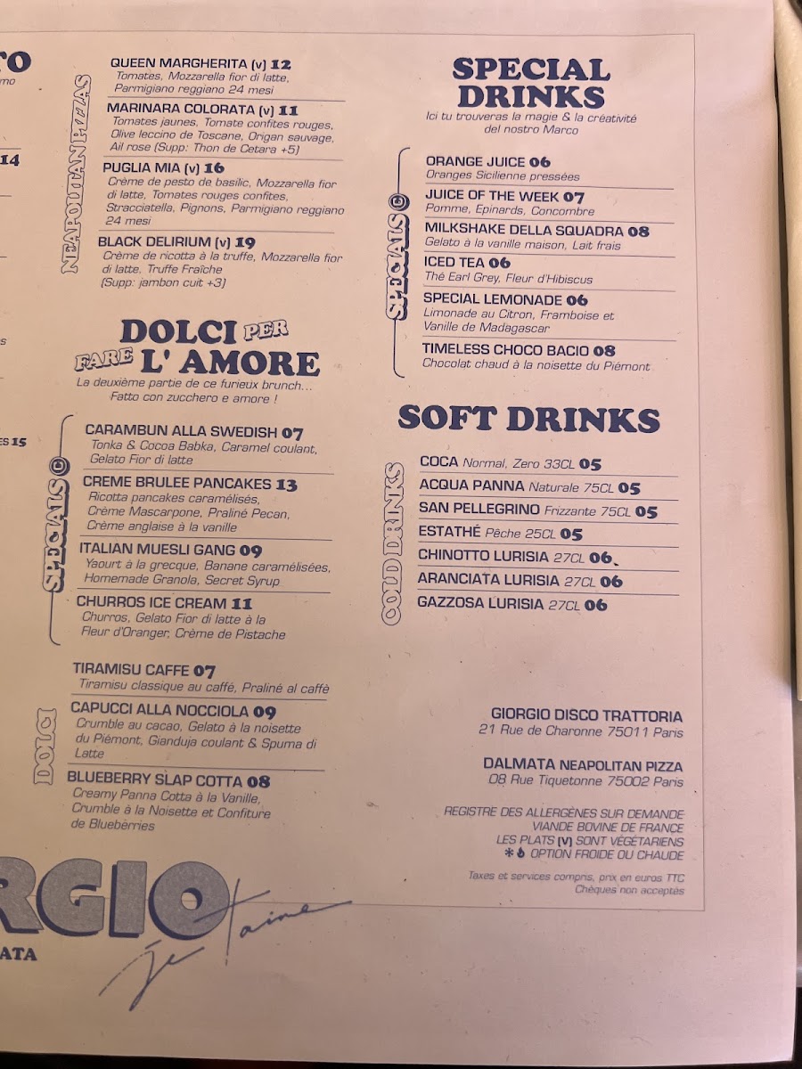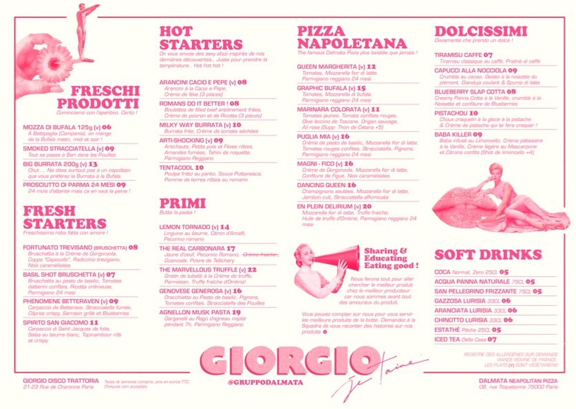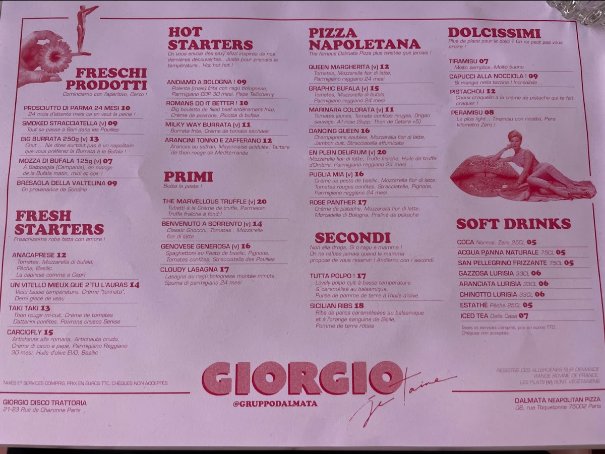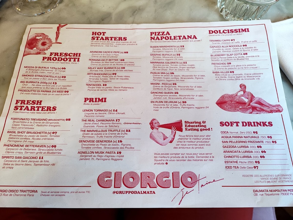 Introducing the menu at Dalmata Paris 11 (Ex Giorgio), a gem nestled on Rue de Charonne, offers a delightful journey through authentic Italian flavors. Renowned for its Neapolitan-style pizzas, the menu features a variety of shareable bites, including Cacio, Pepe & Amore fried balls, which harmoniously blend crispy textures with creamy ’nduja sauce. Don't miss the iconic Big Burrata, a true taste of Puglia, or the tempting Milky Way Burrata that pairs beautifully with sundried cherry tomato cream. For a sweet finish, indulge in their unique Limonemisu, a refreshing twist on the classic tiramisu. Each dish is crafted with fresh ingredients, ensuring vibrant flavors and an unforgettable dining experience. With attentive service and a lively atmosphere, Dalmata Paris 11 promises not just a meal, but a celebration of Italian culinary traditions.